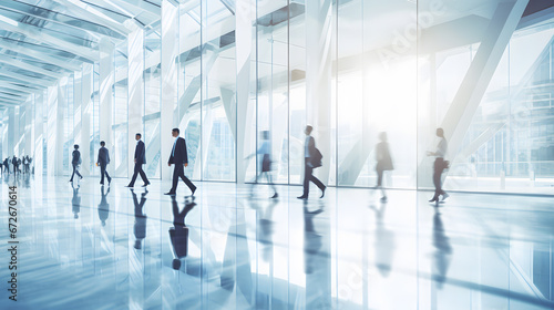Blurred group of business people walking in a modern office banner. Crowd of business people walking in office fast moving with blurry business decks glass fronts