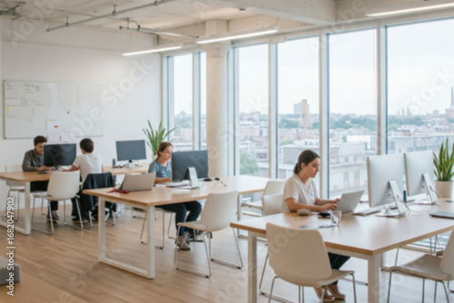 Blurred image of a Collaborative Office Space: Individuals Working at Desks with Computers in a Bright Area Featuring Large Windows and a City View. To be used as background