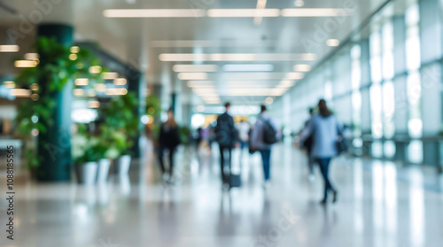 Blurred image of people walking in a modern building with large windows and natural light, conveying a sense of movement, activity, and urban life. Ideal for business, travel, or architecture-themed p