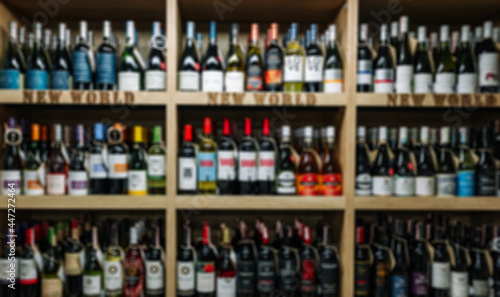 Blurred image of Various wine bottles sale on the wooden shelf in a supermarket shop.