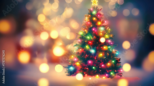 Blurred lights surround a colorful, glowing Christmas tree, soft focus, winter wonder