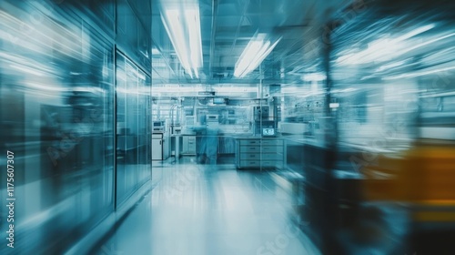 laboratory, science, technology, research, experiment, motion, blur, speed, innovation, discovery, progress, future, industrial, factory, equipment, machinery, medicals, health care, clinical, analysis, testing, development, clean, sterile, modern, contemporary, hallway, corridor, blue, teal, cyan, light, bright, dynamic, fast, movement, process, work, investigation