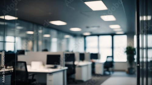 Blurred office interior meeting room with desks, chairs and monitors. Blurry working space with softly defocused effect. For background or backdrop use in business concept