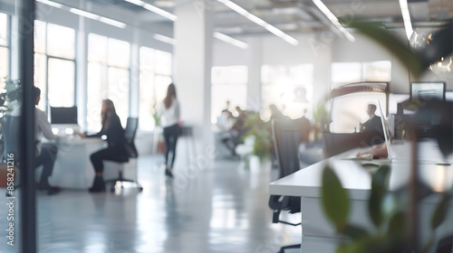 Blurred office interior with people working in the background, white and light grey colors, blurred or bokeh effect for a modern business work environment concept. Blurred white empty space background