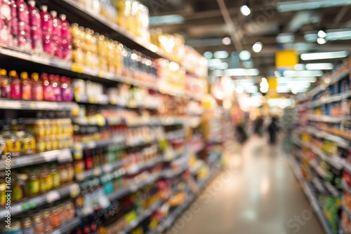 supermarket, aisle, grocery, food, shelf, drink, product, blurry, blurred, store, shopping, consumer, produce, canned, packaged, bottle, jar, aisle, liquid, light, lighting, ambience, interior, wide, depth, defocused, client, people, walking, retail, commerce, economy, buying, market, food market, display, fresh, healthy, variety, abundance, consumerism, modern, bright