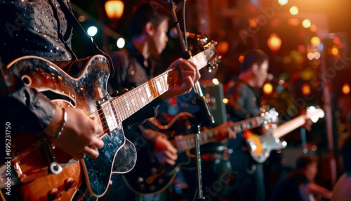 Blurry guitarist on concert stage with band in recording studio for digital ai music concept
