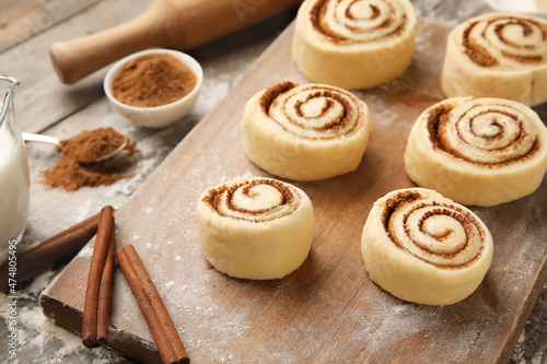 Board with uncooked cinnamon rolls on wooden background, closeup