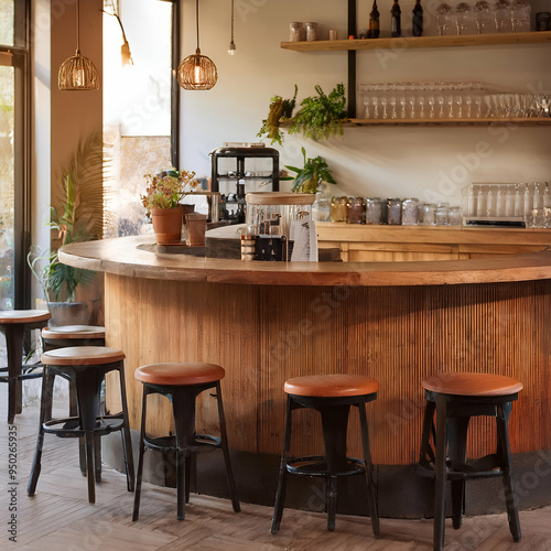 Bohemian coffee shop featuring vintage lighting and potted plants, ideal for a relaxing getaway. Cozy, wood-paneled bar with curved counter and high stools