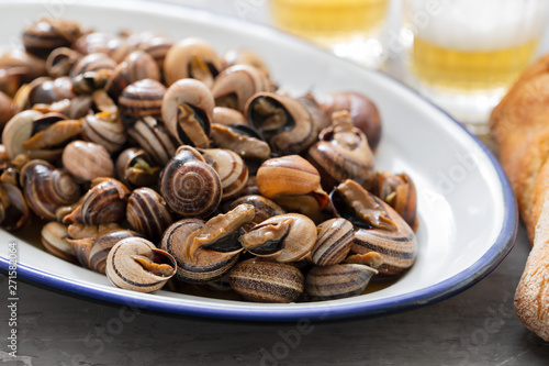 boiled snails with herbs in white dish on ceramic background