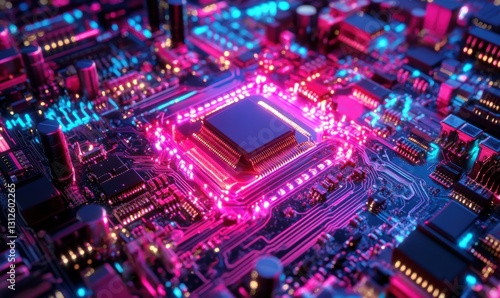 Bold depiction of abstract glowing circuitry illuminated by vibrant neon light creating a futuristic and dynamic digital design .