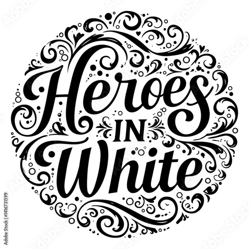 Bold, stylized lettering "Heroes in White" surrounded by ornate floral swirls. Classic, elegant design perfect for apparel, prints, or posters. Suitable for advertising and editorial.