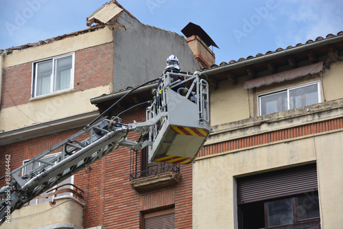 fireman, staircase, emergency, lift, men at work, cage, sos, 112, height, risk, danger, scale, fire, fire, landslide, pulverize, debris, pretending, building, cornice, brick, fall, wounded, accident, earthquake, topple, teamwork, sink, sinking, demolish, burgos, work, working, guild, craft, roof