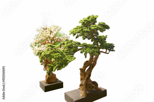 Bonsai trees display with detailed branches and leaves in a light setting during an indoor exhibit for plant enthusiasts and nature lovers