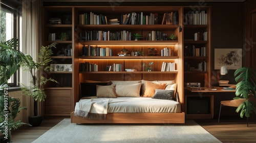 Bookshelf that transforms into a foldable bed, saving space in a stylish home office.