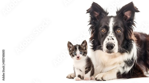 Border collie dog and kitten sit together and look at camera isolated on white background : Generative AI