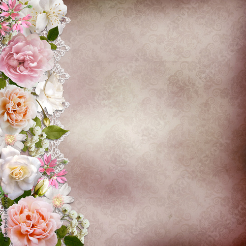 Border of flowers with lace on vintage background