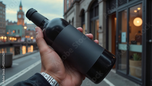 wine bottle, black, hand, city, street, dusk, urban, evening, modern, minimal, elegant, drink, beverage, architecture, outdoors, lifestyle, posh, stylish, single object, casual attire, twilight, trendy, travel, simplicity, wristwatch, city landscape, sleek, professional, downtown, detail, moody, artistic, bottle, wine, macro, closeup