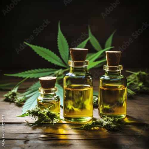 Bottle with marijuana or cannabis extracts with marijuana plants, very holistic