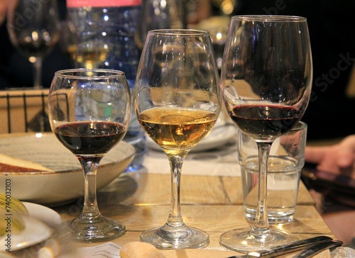 Bottles and glasses of wine. Tasting of sweet Bulgarian wines, Varna (Bulgaria)