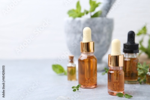 Bottles of aromatic essential oils and herbs on light grey table against white background, closeup. Space for text
