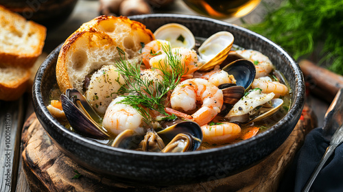 Bouillabaisse Seafood Soup Close-Up with Shrimp, Muscles, Clams, Fish, Fennel , Grilled Bread, and Wine