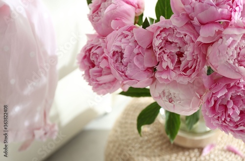 Bouquet of beautiful peonies on pouf indoors, closeup