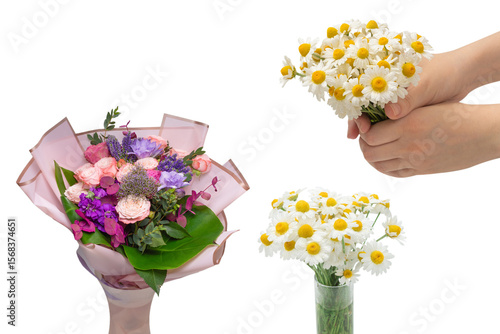 background, background, beautiful, beauty, bloom, blossom, bouquet, bright, chamomile, chamomile, closeup, colours, daisy, floral, flower, fresh, green, isolated, light, natural, nature, plant, rain, spring, summer, summer getaway, sun, white, wildflower, yellow, woman, hand, holding