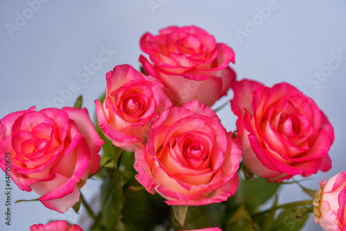 Bouquet of pink rose flowers close up,flat lay
