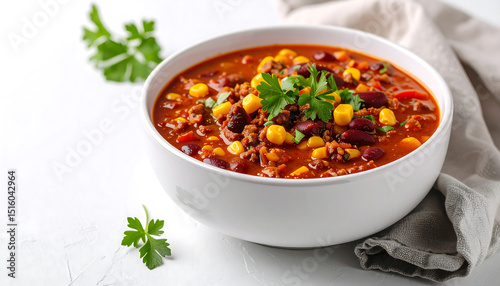 chili, chili con carne, soup, stew, food, meal, dish, bowl, white bowl, ground meat, meat, beef, bean, corn, vegetable, tomatoes, red, brown, yellow, savoury, spicey, delicious, tasty, warm, hot, comfort food, parsley, herb, garnished, prepared, ready to eat, white background, still life, closeup, nobody, culinary, home cooking, eatery, dinner, lunch, dinner, portion, hearty, mexican food, stewed