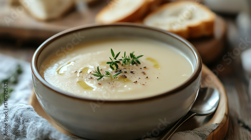 Bowl of creamy soup with toasted bread, natural light home scene concept
