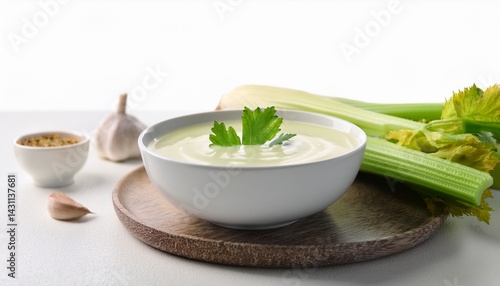 bowl of delicious celery soup served on white table closeup