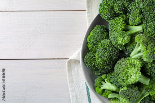 Bowl of fresh raw broccoli on white wooden table, top view. Space for text