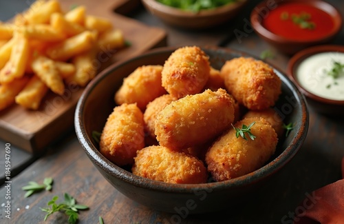 Bowl of golden croquettes sits beside french fries and dipping sauces. Appetizer meal is fresh fried served on wooden table. Delicious fried food is ready for eating.