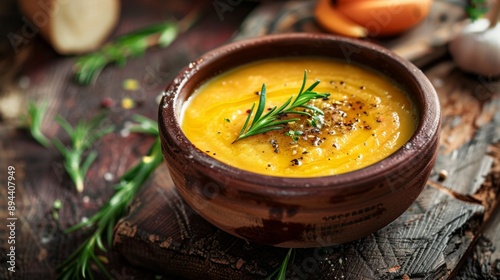 pumpkin, soup, bowl, herb, rustic, creamy, fresh, warm, inviting, culinary, presentation, food, delicious, homemade, alimentary, vegetable, comforting, seasonal, appetising, garnish