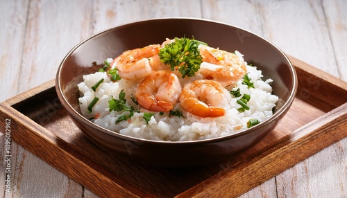 bowl of rice with shrimp and green herbs on a wooden tray