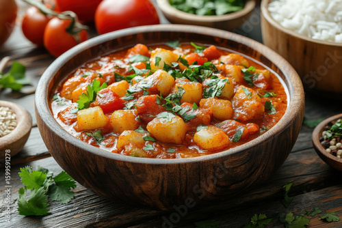 Bowl of stew with potatoes and tomatoes.