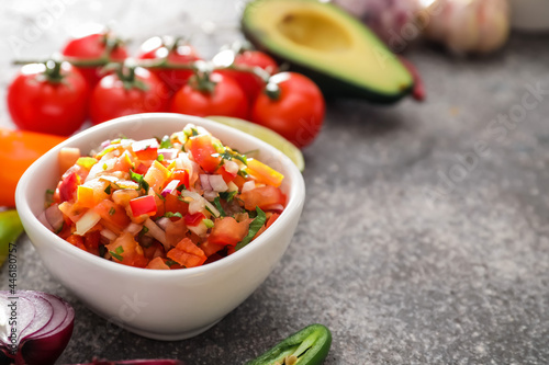 background, bowl, chili, chopped, closeup, colours, copy, cookery, dip, eating, food, fresh, grey, grunge, healthy, hispanic, homemade, hot, ingredient, low-calorie, meal, mexican, mexico, mix, natural, object, organic, pico, red, ripe, salad, salsa, sauce, space, spicey, table, tasty, text, tomatoes, traditional, vegan, vegetable, vegetarian
