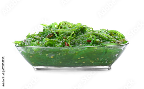Bowl with tasty seaweed salad on white background