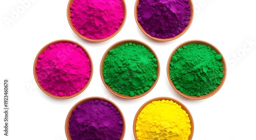 Bowls of Bright Holi Gulal Powder Top View on White