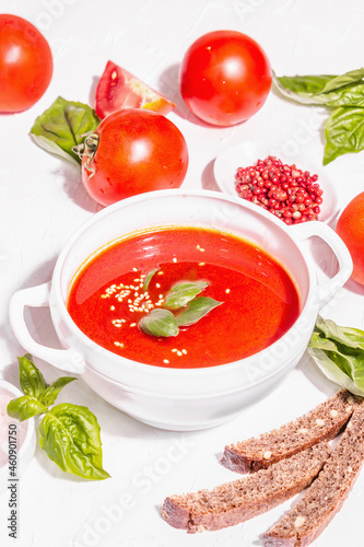 Bowls with homemade tomato soup. Ripe vegetables, fresh basil leaves, breadsticks, aromatic spices