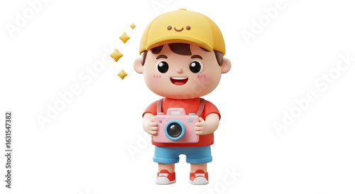 boy, holding, camera, smiling, wearing, cap, cartoon, illustration, character, children, children, person, portrait, isolated, standing, looking, cute, happy, cheerful, playful, yellow, pink, blue, red, white, star, floating, shining, digital, graphic, design, artwork, children, render, studio