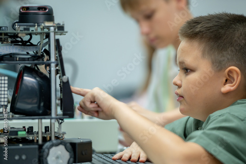 Boy male teen child concentrate enjoy Machine Learning Robot is Moving Under Control robot coding at technology stem class, stem education robot for digital automation artificial intelligence ai