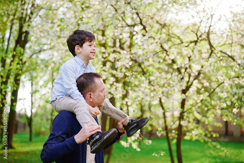 boy on father's shoulders enjoying blossom-filled park. capturing family bonding, springtime joy, and outdoor relaxation. perfect for depicting parent-child connection and nature's beauty