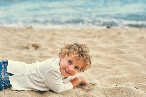 boy playing with sand on the beach