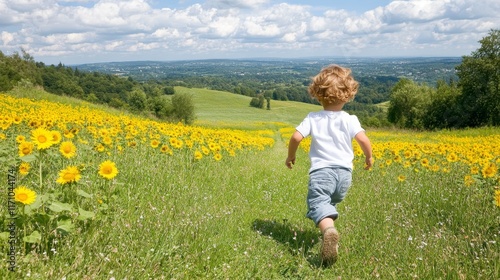 Boy Running Through Field of Sunflowers with a View, Childhood Memories, Summertime Fun