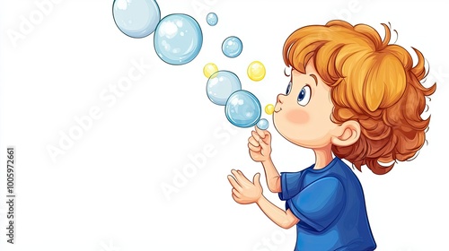 boy, children, bubble, blowing, soap, round, blue, yellow, white, cartoon, illustration, happy, cheerful, playing, childhood, fun, air, light, transparent, colourful, whimsical, playful, smile, grin, hand, finger, arm, shirt, curly, hair, background, isolated, graphic, design