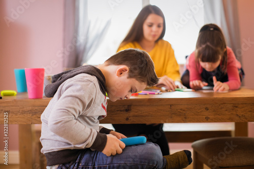 boy, down's syndrome, use, digital, tablet, dining room, entertainment, disability, technology, wireless, online, cyberspace, read, watch, video, game, play, motion picture, sharpened, condensed, table, innocence, casual attire, clothes, family, domestic, lifestyle, leisure, brother, sister, togetherness, elementary, children, girl, teenage, caucasian, three, people, adult, indoor, day, tilt, to sit, look, down