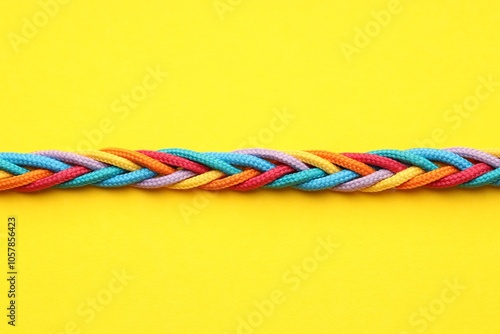 Braided colorful ropes on yellow background, top view. Unity concept