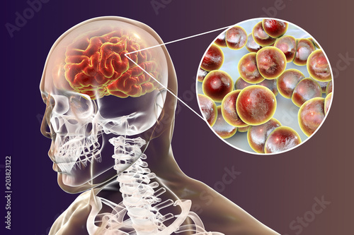 Brain infection with Neisseria meningitidis bacteria, 3D illustration. Gram-negative diplococci that cause meningitis and encephalitis