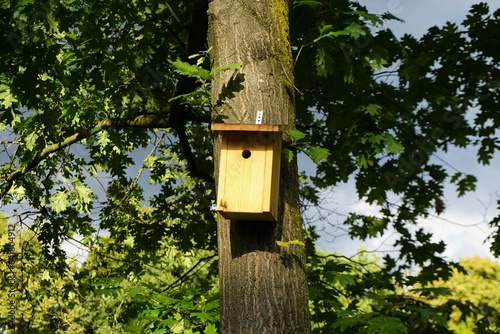 Braunes Vogelhäuschen an Baumstamm von Baum mit grünen Blättern vor Himmel in Park bei Regen und Sonne am Abend im Sommer